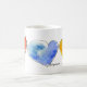 Três corações de aquarela numa caneca de café. Ouro amarelo, azul verdadeiro e vermelho vivo. PERSONALIZAR pressionando o botão personalizar. Adicione sua própria mensagem personalizada, escolha entre várias fontes, de formal a informal. Mude o estilo da caneca, fique com as cores do sotaque ou o calor desaparecendo da caneca.