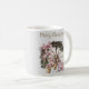 Três Gnomos Coffee Mug. Este design adorável tem três gnomos bonitinhos tomando café se preparando para o dia deles. No fundo, coloca-se uma roda de vagão vintage decorada com evergreens e fitas cor-de-rosa. Edite as saudações e os nomes de família para suas próprias escolhas. Se desejar, você pode alterar a cor de fundo para corresponder ao decoração e estilo do feriado.