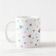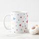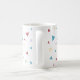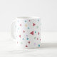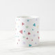 Uma caneca clássica moderna e cônica com formas geométricas de triângulos e espirais em verde pastel, amarelo e vermelho.