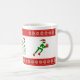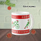 Há três atletas estilizados na silhueta nesta caneca: um nadador, um ciclista e um corredor. Cada um tem a cor verde de Natal, vestindo um chapéu festivo, e a velocidade para trazer uma parcela especial de natal. Acima e abaixo está uma faixa vermelha com um padrão estilizado de flores de poinsettia em cores verdes, brancas e douradas. Há um espaço aqui para você personalizar a caneca adicionando um nome, iniciais ou outro texto.