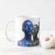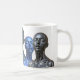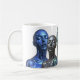 Three futuristic female androids in blue, chrome, and green tones with closed eyes, featured on a white mug.