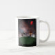 Um pequeno robô vermelho voa seu balão enquanto as explosões atômicas explodem à distância.