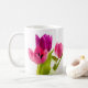 Decore sua cozinha para a temporada de primavera com esta linda caneca de café tulipa rosa. Esta caneca apresenta um buquê de flores de tulipa e folhas verdes e caule. Este design de aquarela floral criado digitalmente fica lindo nesta caneca de cerâmica branca. Use esta caneca para todas as suas festas e reuniões de feriado, incluindo a Páscoa e o Dia das Mães.