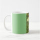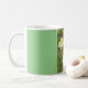 Uma caneca clássica, com uma foto de tulipas, e um fundo verde claro.