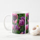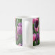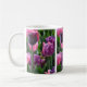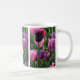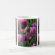 Uma bonito caneca fotográfica de tulipa com flores de púrpura e rosa.