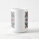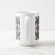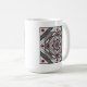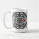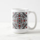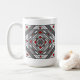 Uma mandala quadrada concêntrica assume a aparência de um túnel que desenhar o espectador com uma combinação de linhas angulares, triângulos e círculos em tons de cinza, vermelho e branco para quase criar uma ilusão ótica. Outras cores e estilos de caneca estão disponíveis, incluindo canecas de viagem e canecas de cerveja.