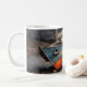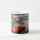 um velho barco branco, azul e vermelho chamado "Tugger" corre em terra.
