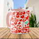 Esta caneca colorida apresenta uma multidão de corações vermelhos e cor-de-rosa sobre fundo branco, com um único coração azul verde no meio que é "um em um milhão". O padrão está bordado em vermelho.