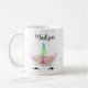 Uma caneca de café bonita e colorida para quem ama unicórnios. Adicione o nome à parte de trás do copo. Arco-íris, cores e flores, com um unicórnio fofo. Faz um presente excelente para aniversários e Natal. Um copo divertido para jovens bebedores de café e adultos.