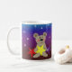 Um ursinho bonitinho segurando uma corda de estrelas em vermelho, amarelo e roxo. Um fundo de azul e roxo com pequenas estrelas brancas e flocos de neve.