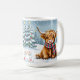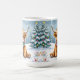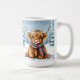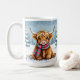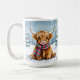Esta linda caneca de café sazonal de Natal que tem uma ilustração do estilo aquarela de um bebê Highland Cow sentado num campo de neve balbuciosa durante um dia de inverno com um pano de fundo de pinheiros decorados de férias.