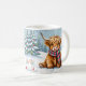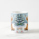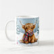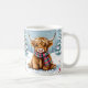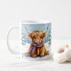 Esta linda caneca de café sazonal de Natal que tem uma ilustração do estilo aquarela de um bebê Highland Cow sentado num campo de neve balbuciosa durante um dia de inverno com um pano de fundo de pinheiros decorados de férias.