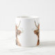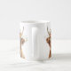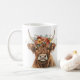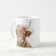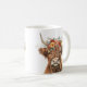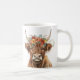 Uma caneca de café com uma Vaca Highland, com uma vila floral.