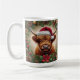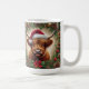 Uma alarmante vaca Highland vestindo um chapéu de Papai Noel em meio a um arranjo festivo de pínus cones, Holly, e ornamentos. Perfeito para celebrar o feriado com um toque de charme rústico.