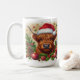 Uma adorável vaca Highland adornada com um chapéu de Papai Noel está rodeada de decorações festivas de Natal, incluindo cones de pinho e baubles, com uma atmosfera acolhedora e alegre.