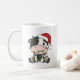 A Vaca no Natal com luzes de fada. Animais engraçados com presentes e neve nas férias. Uma doce saudação de Natal. As vacas são animais bonitos e perfeitas para o Natal.