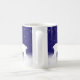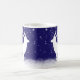 Duas silhuetas brancas de cervo andando pela neve enquanto os flocos de neve caem sobre um fundo azul-crepúsculo cria uma bela caneca de café para as férias.