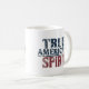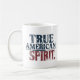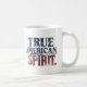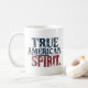 Uma caneca branca clássica com a frase "Espírito Verdadeiro Americano" impressa em negrito, em cores patrióticas (vermelha, branca e azul) ao redor da borda.