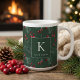 Monograma Botânico Elegante de Natal Cura-d'água Mug apresentando um inseto de verde moderno e gentil de pinheiro e bagas em um fundo verde-escuro da floresta e seu monograma e nome personalizados. Entre em contato conosco em cedarandstring@gmail.com se precisar de assistência com o design ou produtos correspondentes.