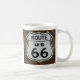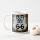 Fotografia de um sinal de rota 66 montado num edifício de madeira. Design impresso em ambos os lados da caneca.