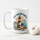 Garrafa de água da praia. Ilustração de uma cena de praia com farol, pranchas, palmeiras e golfinhos. Adicione nome ou citação na área de personalização.