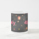 Fogos de artifício. Celebrar o Dia da Independência com esta caneca de 4 de julho. Fundo de fogos de artifício explosivos contra o céu negro. "4 de julho" está em vermelho com sombra azul.