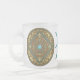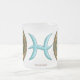 Esta mandala Peixes apresenta uma pedra aquamarina cercada pelo símbolo da placa, a constelação, e o símbolo alquímico de Água entre filigrana e tecelagem. Estão disponíveis outros tamanhos e estilos de caneca, incluindo canecas de viagem e canecas de cerveja.