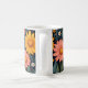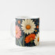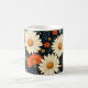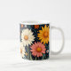 Grandes e belas margaridas pintadas em rosa-rosado, vermelho-tijolo, branco-marfim e ouro ensolarado sobre fundo escuro com flores menores espalhadas por cima. Perfeito para quem ama flores e natureza.