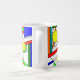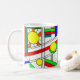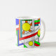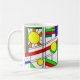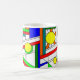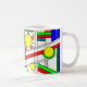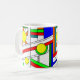 Esta caneca tem um design moderno do século médio de um olhar colorido com linhas pretas e círculos cheios de cores primárias e secundárias.