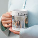 Peça à sua irmã, melhor amiga ou sobrinha para ser sua dama de honra no seu casamento com esta caneca de colagem de fotos moderna e elegante. Com 3 fotos quadradas de você e a pessoa que você está convidando, com fonte script que pode ser alterada para qualquer cor. Todo o texto é facilmente personalizado usando o modelo fornecido.