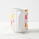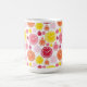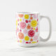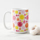 White ceramic mug featuring a pattern of colorful clocks and pocket watches in red, pink, yellow, and orange tones on a light background. Playful and vibrant.