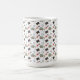 White ceramic mug featuring a playful pattern of postal stamps and envelopes in red, black, and gray, conveying a theme of communication and nostalgia.