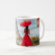 Uma mulher graciosa com um guarda-chuva vermelho cai em direção à Torre Eiffel em uma brisa suave do outono. Charme romântico parisiense em tons vermelhos e dourados.
