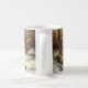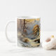 Two houses on a snowy morning, beside a river and sheltered by mountains, make a beautiful winter scene on this holiday mug.
