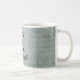 Design de caneca branca para Alice no País das Maravilhas, amantes de todas as idades, apresenta letra maiúscula / C inicial com preenchimento de harlequin preto e azul e ilustração original do Rabbit Branco que foi pintada, em um fundo de cor azul-azul, floral e vírgula angustiado. Personalizar com nome ou outra mensagem