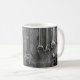 Uma fotografia a preto e branco de ferramentas bem ordenadas penduradas num conselho de madeira numa oficina.