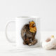 Esta é uma caneca de café com a imagem de uma revista Windstone Editions Male Griffin pintada como uma galinha da Campaine. Há um pintinho de grifo no centro.