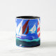 Uma caneca da campainha, umas brancas com punho e a borda pretos, o design dos barcos de navigação são feitas de uma colagem de papel pintado à mão.