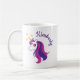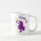 Uma caneca de cavalo unicórnio personalizada para meninas. Adicione o seu nome personalizado a este copo grande. Bonito ideia de presente de aniversário para filha, neta, prima, amiga, irmã, colega de trabalho, professora, mãe. Modelo de tipografia de guião elegante com um animal de conto de fadas feminino. Bebidas brancas de 11oz para casa, escola ou escritório.