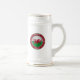Uma representação em 3D da bandeira nacional galesa, sentada no meio da design A capital, Cardiff, está no topo da imagem, e o país, País de Gales, está no fundo da imagem. Entre as duas partes do texto estão estrelas decorativas e duas pulgas de lista.