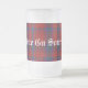 caneca de cerveja de vidro de xadrez escocesa, com aspecto de excelente, feita no padrão clássico azul, vermelho, roxo, clã verde MacDouogall tartan. O texto do estilo do mundo antigo, em branco, lê Slàinte Gu Soírraidh, um brinde gaélico escocês que significa Saúde / bem Ser sempre e para sempre, e pode ser personalizado para ler o que você quer.