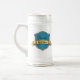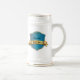 O na moda personalizou a caneca de cerveja do presente de casamento com gráficos de uma chapa azul e goldtone do shinny do protetor do estilo, em ambos os lados. Personalize o texto preto, na chapa, para ler qualquer coisa que você quer. Excelente como presentes à festa de casamento do noivo.