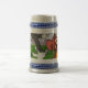 This is a ceramic beer stein-style coffee mug featuring a colorful Tom and Jerry cartoon design. The mug showcases Jerry the mouse prominently in the center, looking surprised or playful, with Tom the cat partially visible in the background. The stein is crafted in a classic German-style design with ornate blue detailing around the top and bottom rims, and a sturdy handle for easy grip. The body of the mug has a glossy finish, making it both decorative and functional — perfect for fans of the iconic cartoon series.