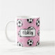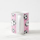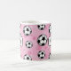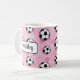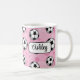 Uma caneca de futebol rosa personalizada impressa com seu nome! É projetado com um padrão de bolas e gols de futebol sobre uma cor de fundo rosa com círculos cor-de-rosa que envolve a caneca. Seu nome, quando personalizado, é impresso em ambos os lados da caneca sobre o padrão de futebol rosa. Faz um presente de excelente para o fã de futebol ou a mãe de futebol na sua vida.