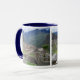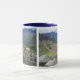 copo branco com o picchu do machu nele com borda e o punho azuis
