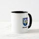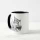 Caneca com desenho de dois marinheiros alemães e o brasão do famoso couraçado alemão Bismarck da segunda guerra mundial com o nome do navio escrito em letras fraktur.