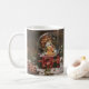 Caneca de natal com um lado a meia na lareira e do outro o globo de neve com urso