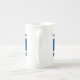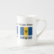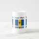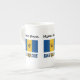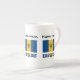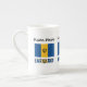 Caneca da China Óssea com a bandeira Barbadiana com a palavra BARBADOS abaixo nas cores da bandeira. Um lugar para o seu nome permite um olhar personalizado. Se precisar de um presente personalizado, adicione o nome de outra pessoa. A bandeira bajana é ultramarina e ouro com um tridente negro. Design nos três lados da caneca.