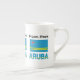 Design, em três lados da caneca da China óssea, mostra a bandeira de Aruba com as palavras ARUBA embaixo da bandeira que combina! Acima, um lugar para seu nome para personalização ou para criar uma aparência especial e personalizada. A bandeira é azul, com duas listras amarelas, e uma estrela vermelha de quatro pontos com uma borda branca.