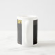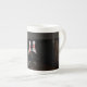 Uma Caneca de porcelana óssea apresentando uma foto de duas pinos de boliche prestes a ser derrubada por uma bola de boliche.